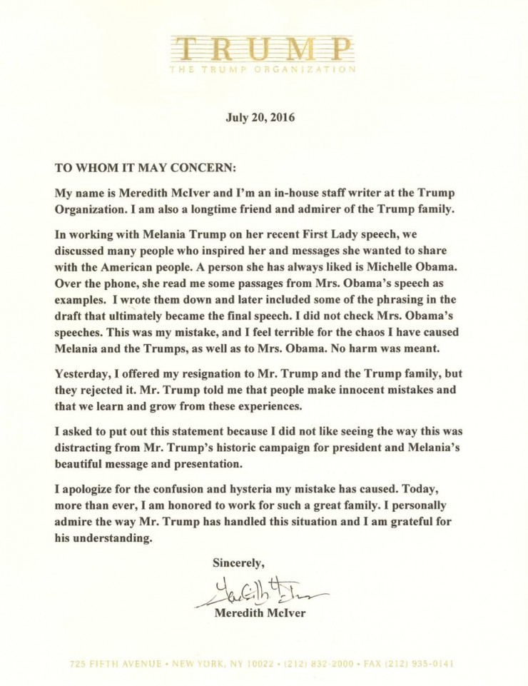 Donald Trump's Staff Writer Meredith Mclver Takes The Blame For Melania's Plagiarized Speech 1