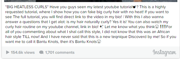 “I think this is really disrespectful. If you are going to take something from someone else or a different culture, be respectful enough to give credit where it is due. You would have gotten more support from these so called “big heatless curls” if you would have just called them their respected name. Bantu knots!!””