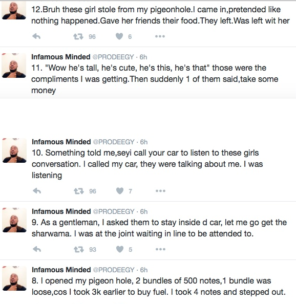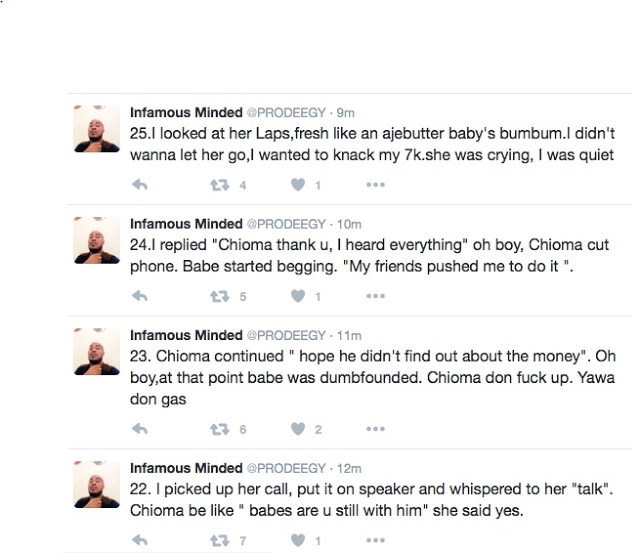 A Nigerian man on twitter has shared his encounter with a UNILAG babe and narrated how she stole his cash and he compensated himself by taking her to his house and F**king the shit outta her.