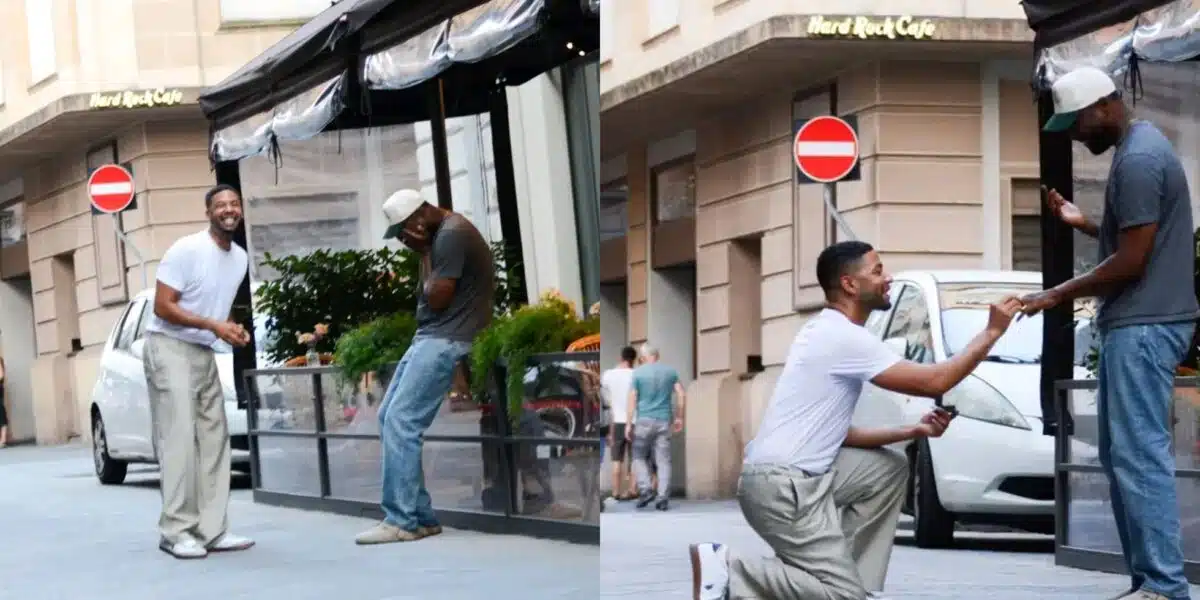 In the first photo, Smollett is down on one knee while Redd looks surprised and excited. Another picture shows Redd cheering with his hands in the air.